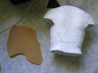 Panssareiden mallaamisen avuksi (koska en omista mallinukkea) Ina ystävällisesti väänsi yläkropastani päälleni kipsimuotin, jota käytin sekä kaavojen mallaamisen että panssareiden muotoiluun. Ilman torsoa kyseinen panssariviritelmä olisi istunut vielä huonommin kuin mitä se nyt istuu. Toinen itkun aihe torsossa oli se, että siinä ei referenssikuvien mukaan ole saumoja juuri missään loogisessa kohtaa, mutta väännäpä tuollainen asia ilman saumoja.