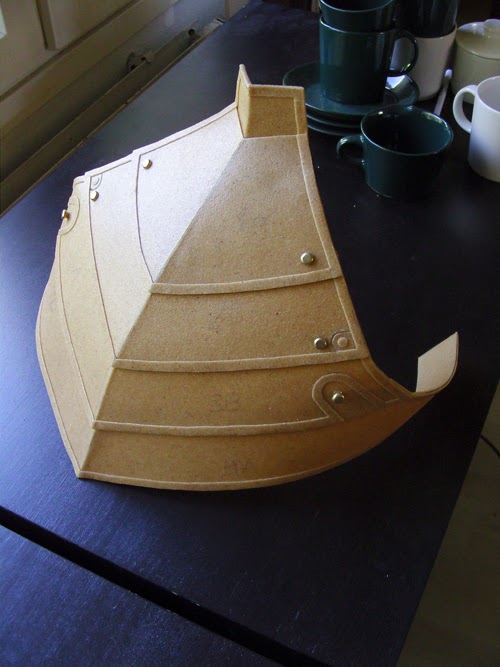 Pääsin pelaamaan ensimmäistä kertaa Worblan kanssa ja sitä tulikin käytettyä ihan urakalla - kaikki panssarit on väännetty siitä. Käsi- ja rintapanssareiden tekeminen oli sinällään helppoa puuhaa että samantapaisia on tullut tehtyä aiemminkin, mutta puvun suurimmaksi murheenkryyniksi osoittautui epämääräinen torsopanssari, missä ei jälleen kerran ole mitään järkeä. Itkin jo ennen puvun aloittamista ettei ko. panssarin tekemisestä tule yhtään mitään, ja eihän siitä meinannut tulla. Oma tulkintani referenssikuvien mukaan oli se, että torsopanssari on nimenomaan kovaa panssaria, kun vertasin materiaalia puvun muihin osiin. Monesti näkee Fenrisin.. yläkroppaongelman hoidettavan siten, että olkapäät tehdään nahkasta ja/tai kiinni tunikaan, mutta itse päädyin tähän ratkaisuun. Toisaalta näkemykseni on myös se, että Fenrisin olkapäissä olevat "sulat" ovat myös panssaria eivätkä oikeita sulkia. Kiitos tulkinnanvaraisuus ja hahmosuunnittelu mikä ei toimi käytännössä koska fantasia!